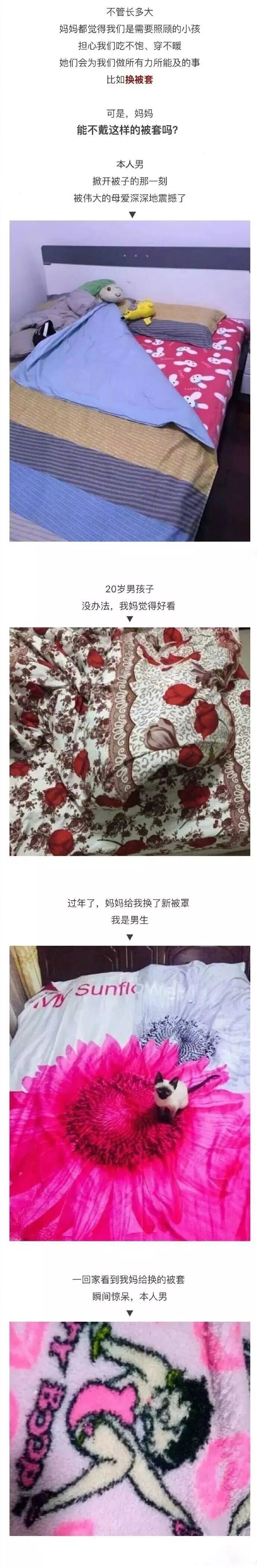 有一种冷,叫妈妈觉得你冷;有一种饿、叫妈妈觉得你饿;有一种爱,叫做妈妈给的被套!不管长多大,妈妈都觉得我们是需要照顾的小孩,担心我们吃不饱、穿不暖,他们会为我们做所有力所能及的事,比如 换被套。