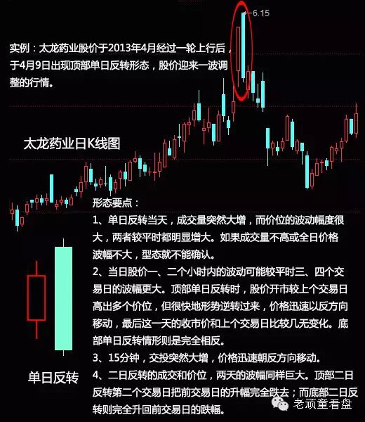2.当日股价一、二个小时内的波动可能较平时三、四个交易日的波幅更大。顶部单日反转时,股价开市较上个交易日高出多个价位,但很快地形势逆转过来,价格迅速以反方向移动,最后这一天的收市价和上个交易日比较几无变化。底部单日反转情形则是完全相反。