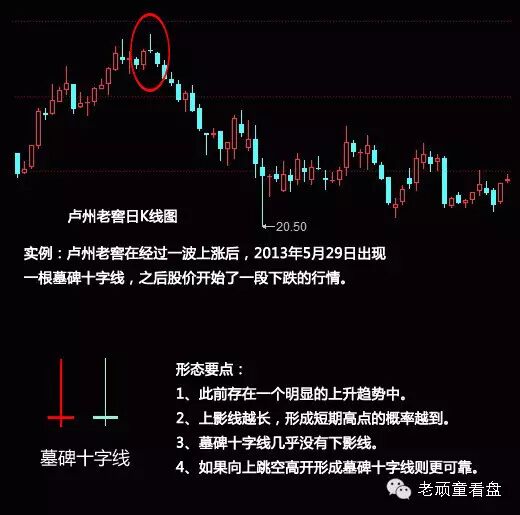 墓碑十字线实例:卢州老窖在经过一波上涨后,2013年5月29日出现一根墓碑十字线,之后股价开始了一段下跌的行情。
