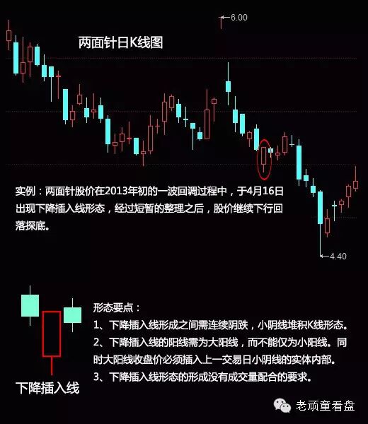 2.下降插入线的阳线需为大阳线,而不能仅为小阳线。同时大阳线收盘价必须插入上一交易日小阴线的实体内部。
