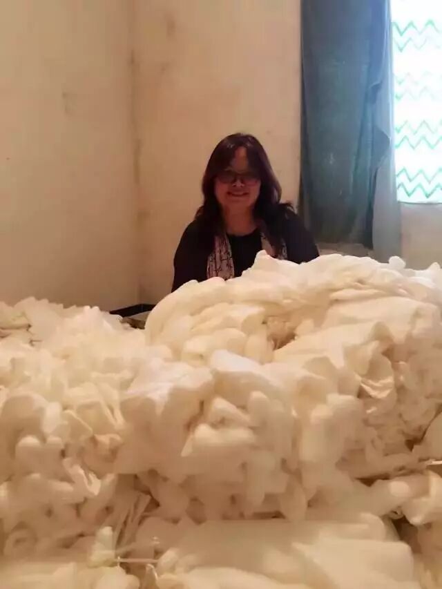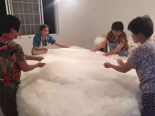 蚕丝是今年丝质最好的桑蚕丝,是我自己收的特级春蚕茧,是完全手工制作,煮茧,剥茧,晒丝棉,最后拉成被子,再用棉网套给罩住,棉网套上有拉锁,可以让大家任意打开检查,因为全手工,所以,被子越大,工时就越多,费用会越高。尤其是在拉被子的过程中,是很累很费力年的活,那么点的茧包,拉成二米以上的被子,大的被子基本是一个小时拉一床,前天晚上我站着拉了两床,当真是累得肩膀疼。