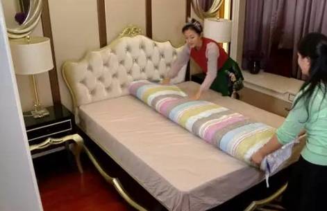 2.把被子平铺在被套上,然后和被套一起折成三折,开口处保持朝向自己。铺被子时被子的四个角要和被套四个角对齐。↓