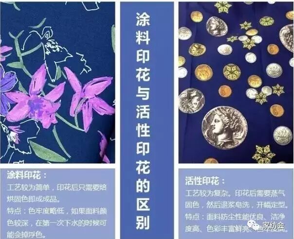 印花:印花是指布织好后,图案再印上去,有活性印花和涂料印花之分。