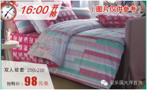 限时抢购:抢!抢!抢!下午16:00点开抢!纯棉双人被套原价298元、抢购价98元、每天限量10条、(抢购时间:2月28日-3月15日)