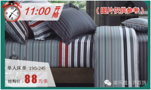 限时抢购:抢!抢!抢!上午11:00点开抢、单人纯棉床单原价198元、抢购价88元、每天限量10条(仅限2月28日-3月15日)数量有限、先到先得、