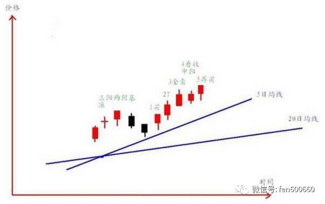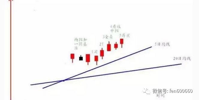 买点基准2:5日线上穿20日均线后出现先三阳后两阴(三阳必卖,两阴敢买)