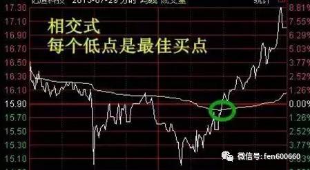 相交式支撑指股价线向下运行与均价线相交的走势。