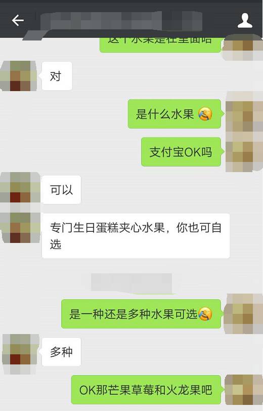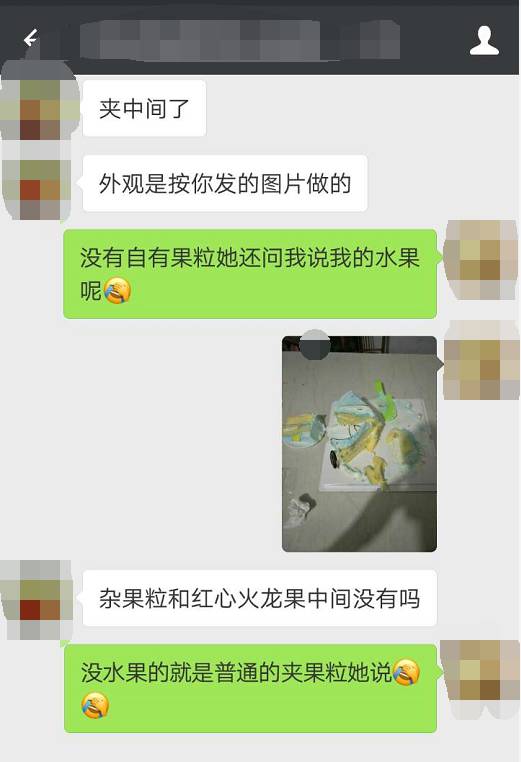 小编:真的很气人,我表妹到他家订了两次蛋糕,因为蛋糕是送人的,不是本人去提货的,两次都是偷工减料不放水果进去(订的是水果蛋糕)。这样很尴尬诶......