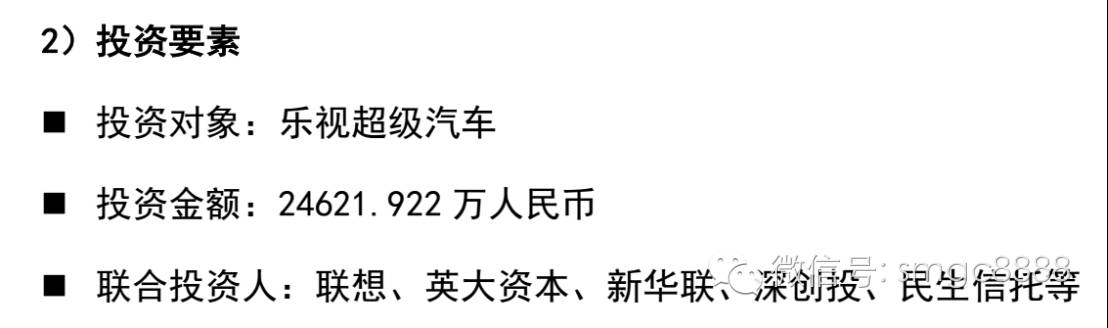 厂长(smgc8888)手里的就有一份以投资乐视汽车为主的股权私募项目书,该私募总规模在3.1亿,共投资三个项目,其中大约2.4亿的资金将投资到乐视汽车。参考下图,为该产品目前最新投资情况: