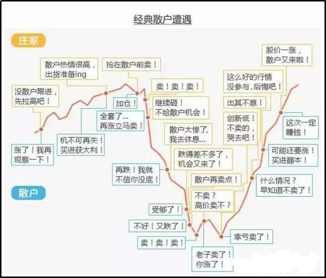 下面这张图大家是不是感觉很熟悉,似乎每一步就是按自己的心路历程来走的。这张图反应了庄家于散户是如何斗智斗勇,心理博弈的,但散户大多完败。