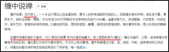 文中人物都可直接百度,李彪(缠中说禅)相信对于一些老股民更是不会陌生,他是“缠论”的创始者,而“缠论”至今都有无数股民或是高手学习应用,下图为百度百科对其的评价。