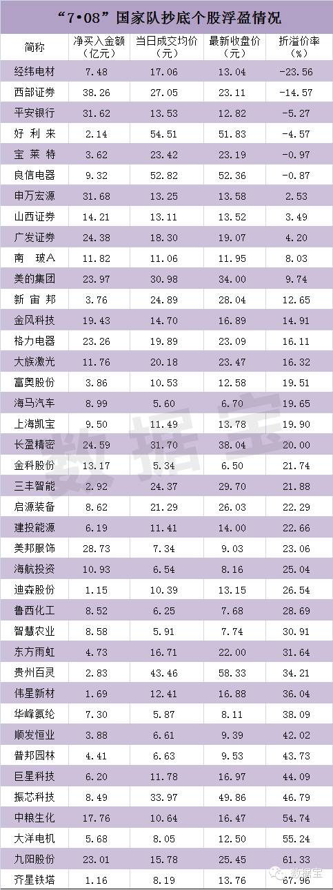 距离大盘7月8日见阶段底部已近一个月。经过近期新一轮的杀跌,大盘最新点位已与国家队大举杀入点位相差无几。然而,单纯从“7·08”国家队大举抄底的个股表现来看,国家队成绩斐然,其中的部分股票甚至频频创出历史新高。