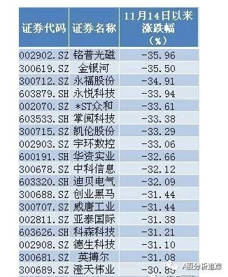 梳理数据发现,自11月14日大盘弱势震荡以来,共有2891只个股出现下跌,下跌超过15%的有583只,曾跌停的有190只。具体来看,铭普光磁以35.96%下跌幅度高居首位,该股期间曾出现两天连续跌停。金银河、永福股份则分别以35.50%、34.91%的下跌幅度排名第二、第三位。
