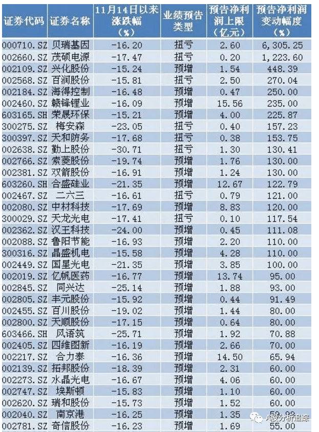 从全年业绩预告来看,上述583只超跌股中,业绩预喜的有104只个股,而业绩预计增长超过50%的有39只个股。其中,贝瑞基因净利润预计增长超60倍。紧随其后的是净利润预计增长超10倍的茂硕电源。