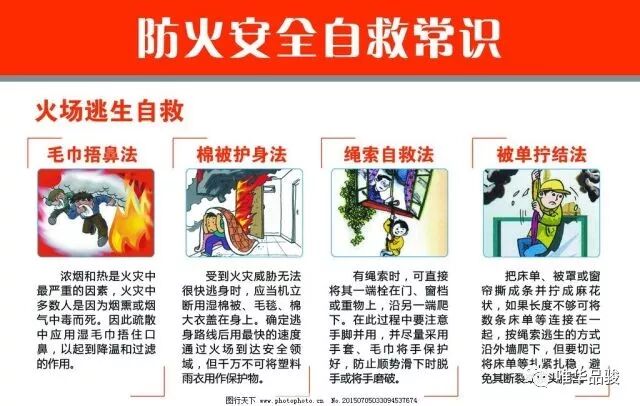 绳索自救法:家中有绳索的,可直接将其一端拴在门、窗档或重物上沿另一端爬下。过程中,脚要成绞状夹紧绳子,双手交替往下爬,并尽量采用手套、毛巾将手保护好。