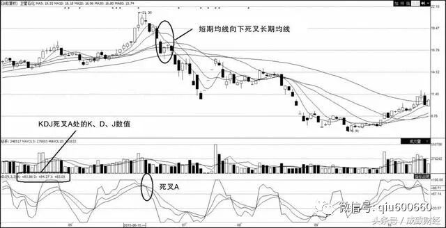 在实战中,这种情况较为常见,KDJ指标的三条线形成死叉也并不都会出现大幅度的下跌,判断这种KDJ指标的卖出提示信号,投资者应综合利用多种技术手段。在图2-15的死叉A中,均线组合粘合、股价重心下移,这时投资者结合KDJ指标的卖出提示,就能得出较为准确的研判结论。