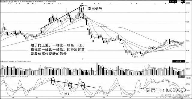 (1)当K值在80左右,并向下死叉D线、J线时,为短线卖出信号(如图2-15所示),KDJ指标的三条线形成死叉之后,股价迎来了一波下跌。