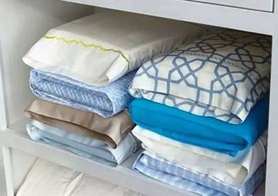 同花色的床单、被套折叠好后收进同花色的枕套里,这样一套套地收纳不容易弄乱花色而且方便收纳。