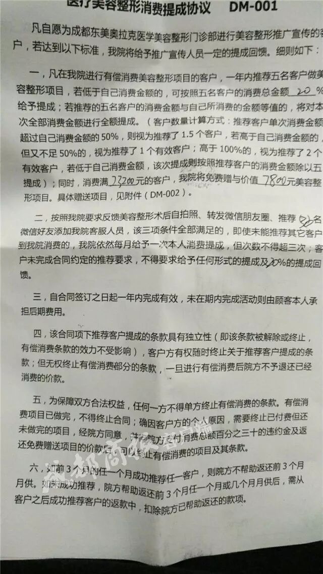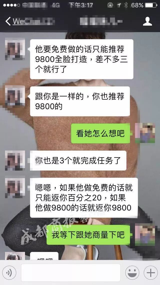 “去的时候告诉我们只要推荐五个人就可以免费整容,没有告诉我要贷款并且要求我推荐的人员消费额度与我的等同。”小戴告诉成都商报记者,她今年19岁,是绵阳一所高校大二的学生,因为成都东美一名工作人员是她的同学,对方不断发微信给她推荐免费整容项目。“我刚好想做一个双眼皮,就带着朋友一起去咨询了。”