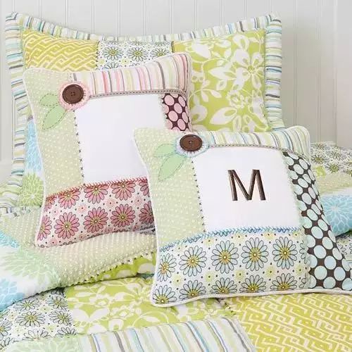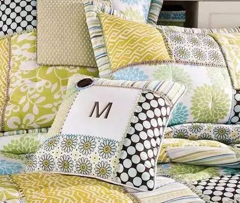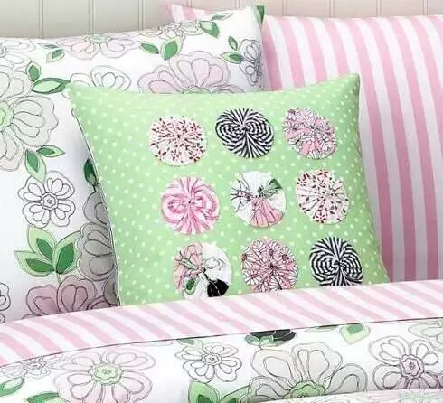 把床单或被套的几种边角料揉成圆形缝在抱枕表面,就像绽放的花朵一样缀满了抱枕。
