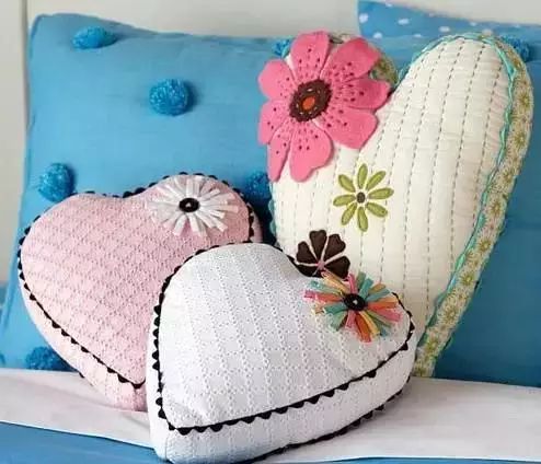 把没用的头饰或者帽檐上的布艺小花拆下来,搭配在心形抱枕的一角。