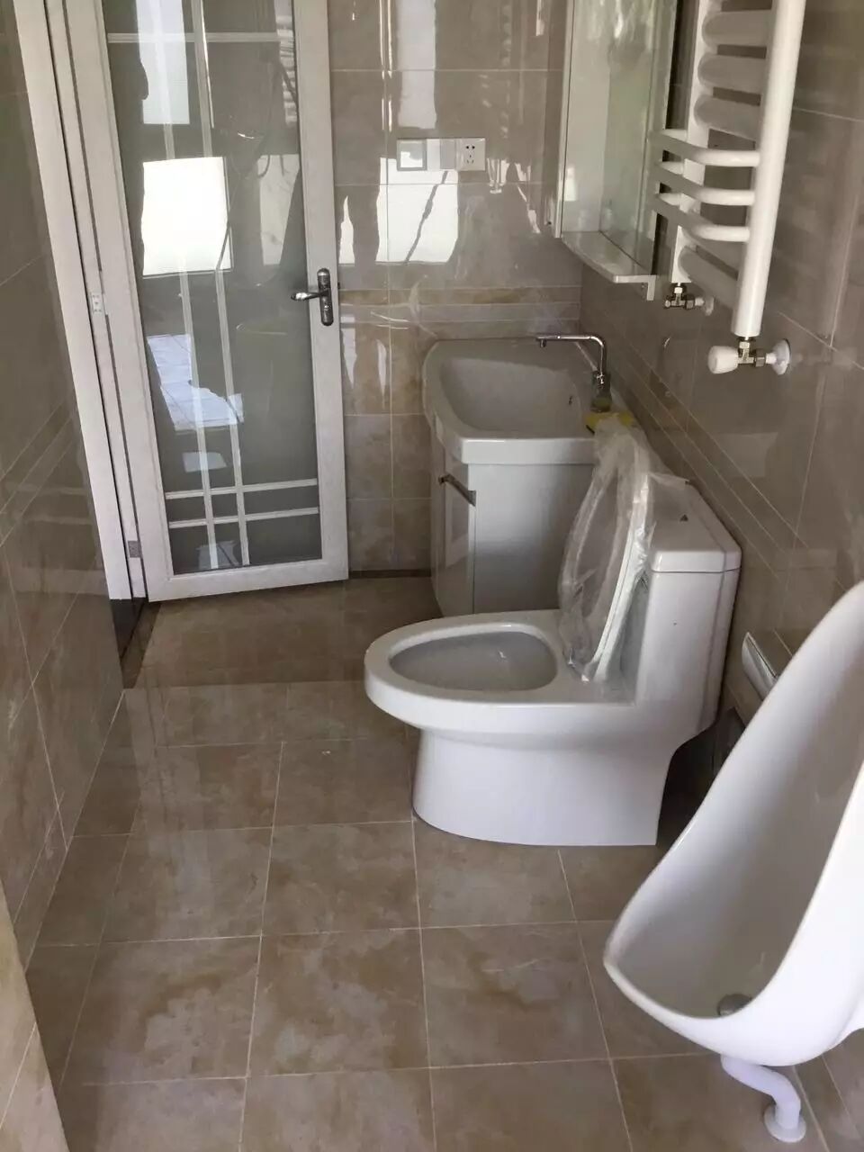 公用卫生间——进入洗手间正前方是洗漱池和挂镜,往右是一个坐便,坐便旁边还做了一个男士专用小便池。洗漱镜旁边暖气片,具有采暖、装饰、收纳的作用,可谓是一身兼多职!
