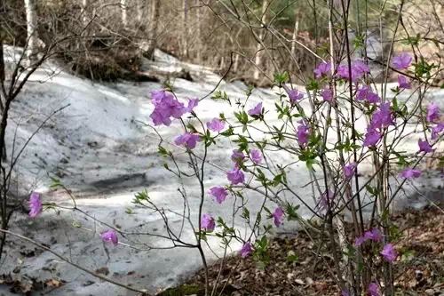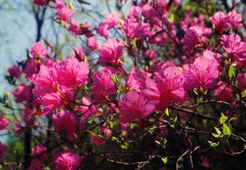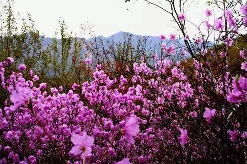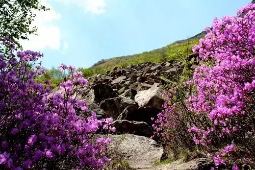 杜鹃山——这里生长着大面积的野生高山杜鹃灌丛。因山地海拔落差大,气候垂直变化,林区内各种野花不但品种多,并且花期格外的长。4月上旬杜鹃便开始从山脚一路向上开放,到5月中旬山顶处才花苞初绽,花期可长达一个半月。在高山杜鹃花开怒放的同时,山麓间白色的山丁子、铁丝花、紫色的野丁香、蓝色的马兰花还有满沟满谷叫不出名的野花,也相继次第开放,一直持续到深秋,竞相散发着自然生命的幽芳。