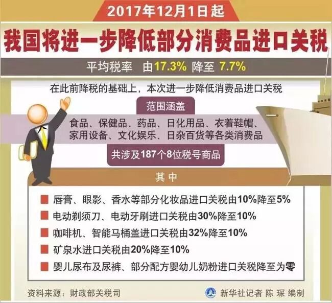 据财政部消息,12月1日起,我国将进一步降低部分消费品进口关税,平均税率由17.3%降至7.7%,覆盖食品、保健品、日化用品等多个领域,共涉及187项商品。